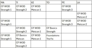 Päivän treeni koostuu alkulämmittelystä, tekniikka- tai voima-osiosta, sekä muutamana kertana viikossa intensiivisestä sykettä nostattavasta MetCon -osiosta, joka parantaa mm lihaskestävyyttä ja hapenottokykyä.